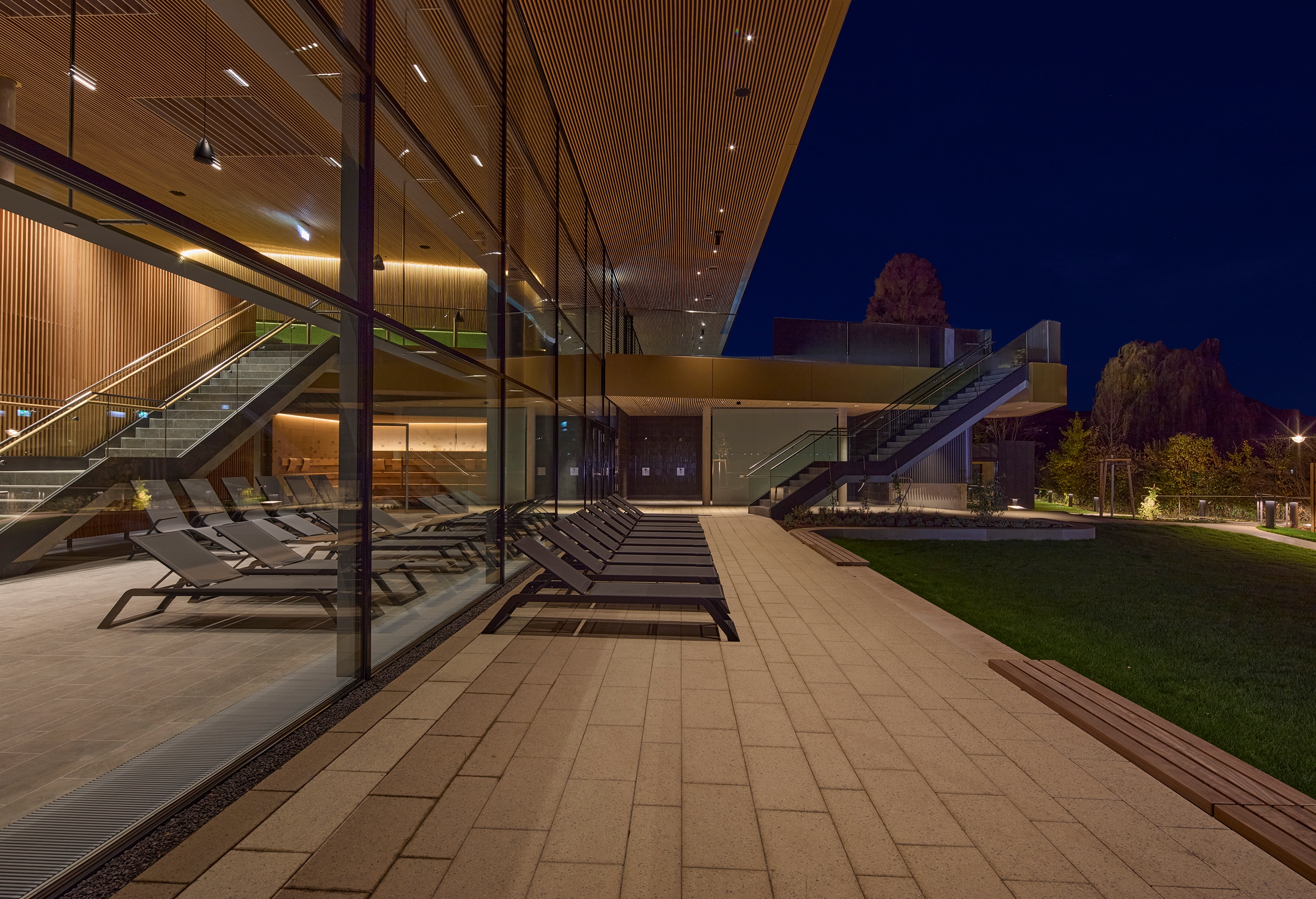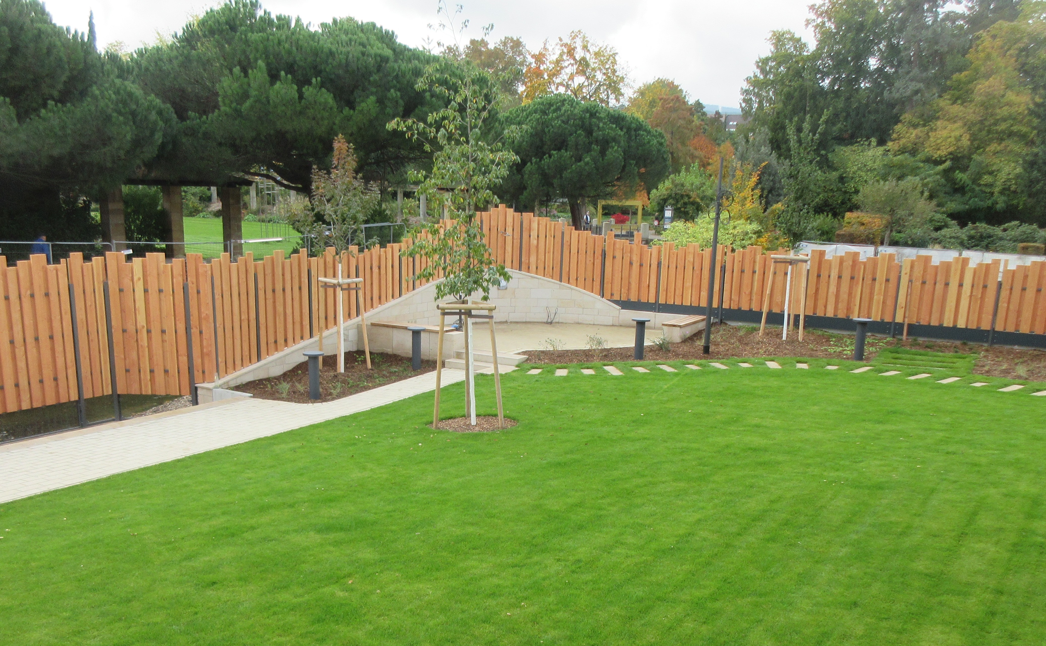 Neubau des Thermen- und Saunagartens mit Anlage von Liegeterrassen und Sitzmauern, Geländemodellierung mit Sandsteinmauern, Holzliegedecks und Erlebnisbereichen. Attraktive und klimaangepasste Begrünung und objektbezogener Holzsichtschutzzaun.