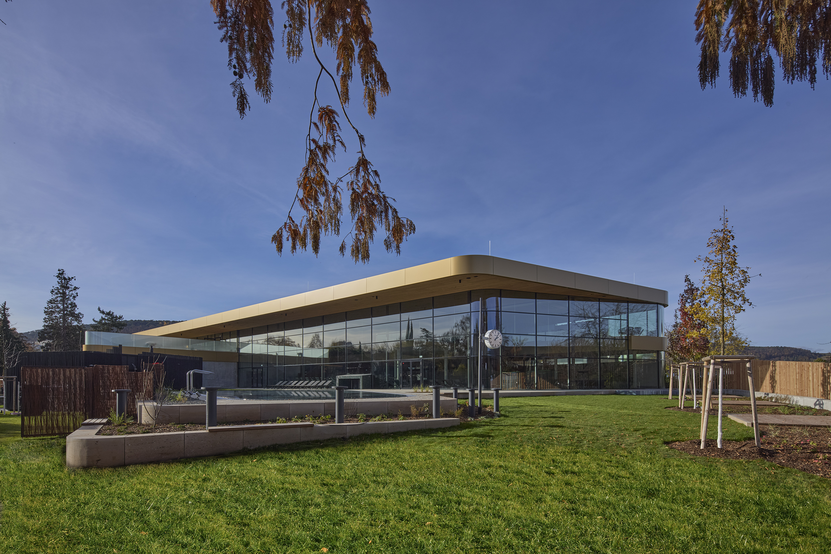 Neubau des Thermen- und Saunagartens mit Anlage von Liegeterrassen und Sitzmauern, Geländemodellierung mit Sandsteinmauern, Holzliegedecks und Erlebnisbereichen. Attraktive und klimaangepasste Begrünung und objektbezogener Holzsichtschutzzaun.